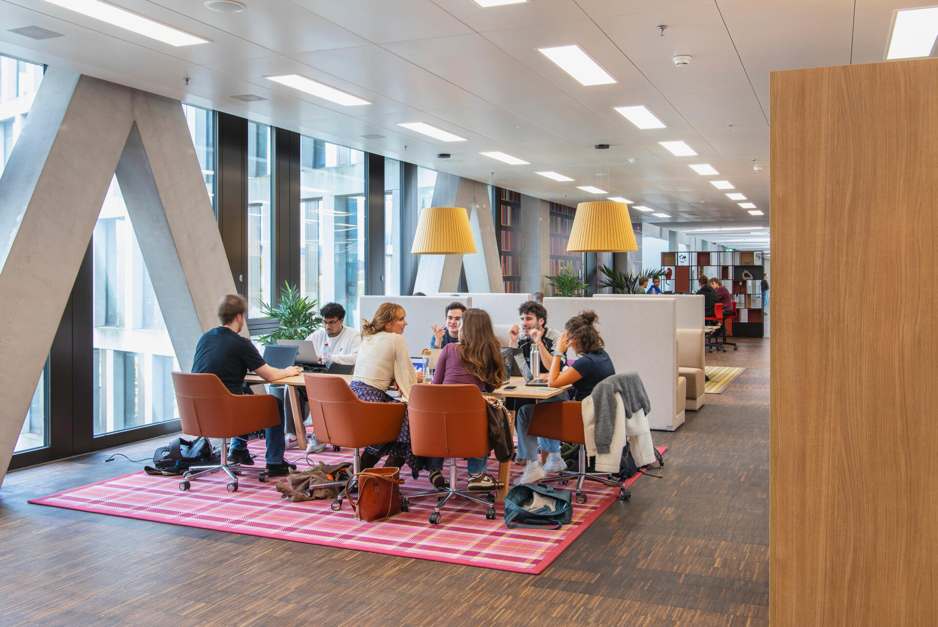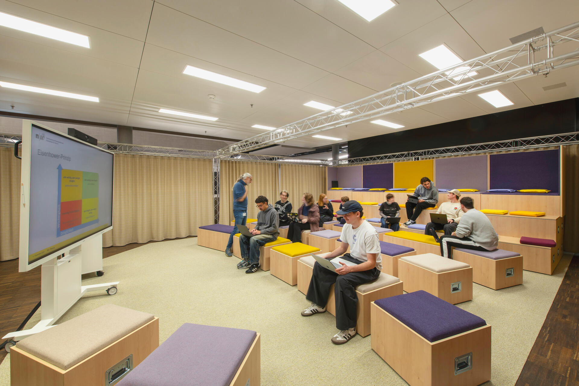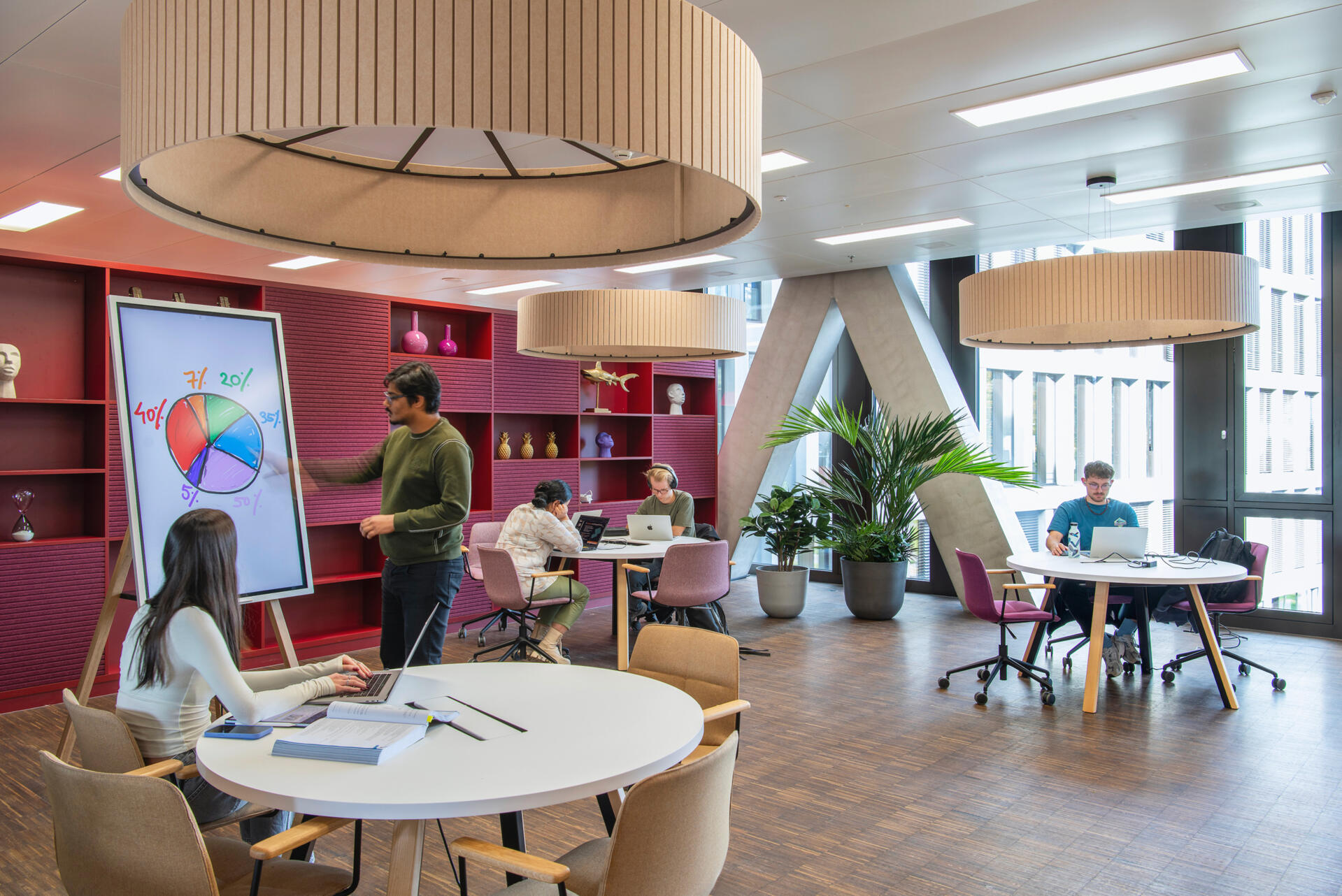 Diese offenen und einladenden Bereiche bieten eine Vielzahl an Möglichkeiten für die Studierenden und Dozierenden, gemeinsam zu lernen, selbstständig und konzentriert zu arbeiten, Unterricht abzuhalten oder sich einfach zu treffen und miteinander ins Gespräch zu kommen – wodurch die Präsenz vor Ort zu einem echten Mehrwert wird.