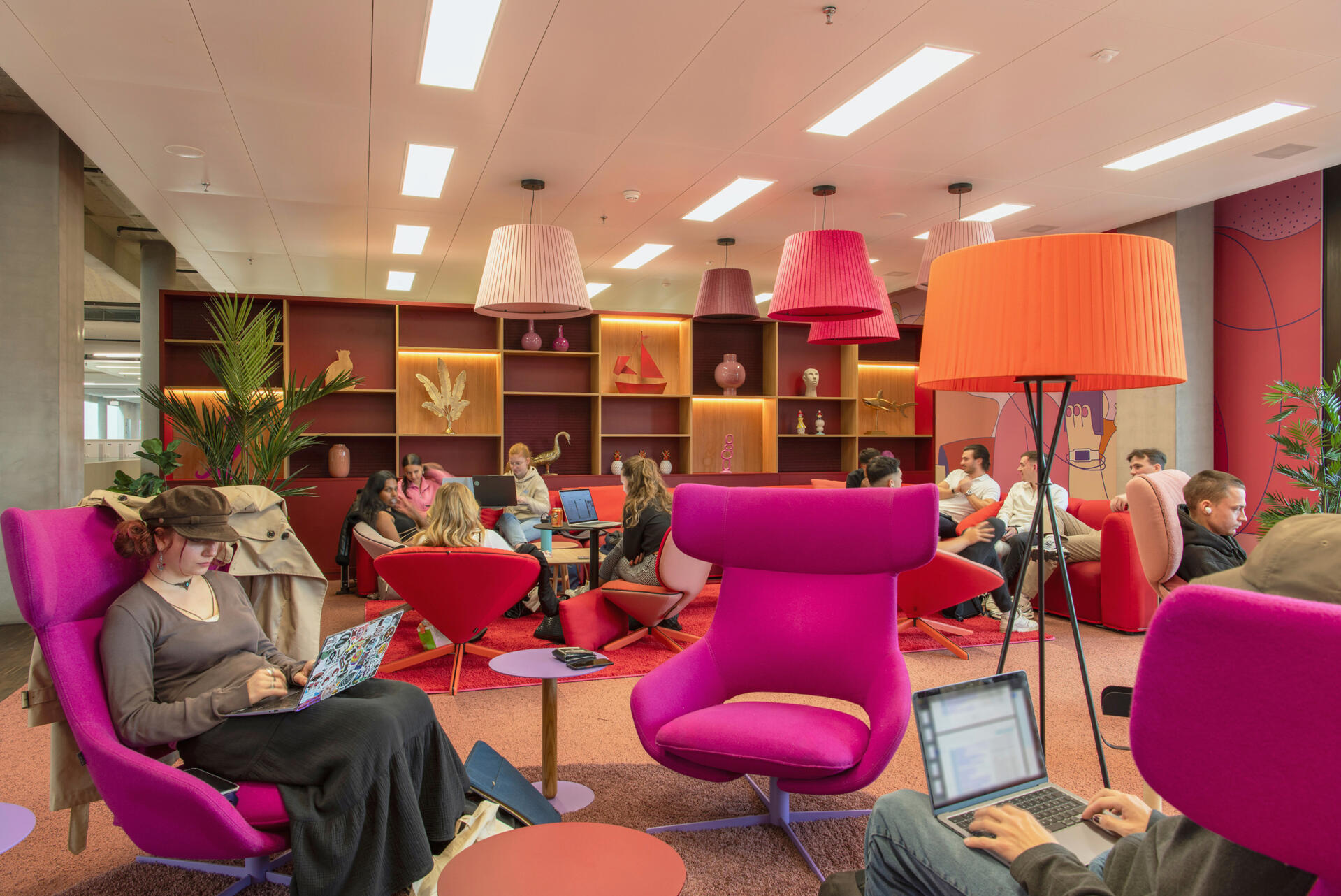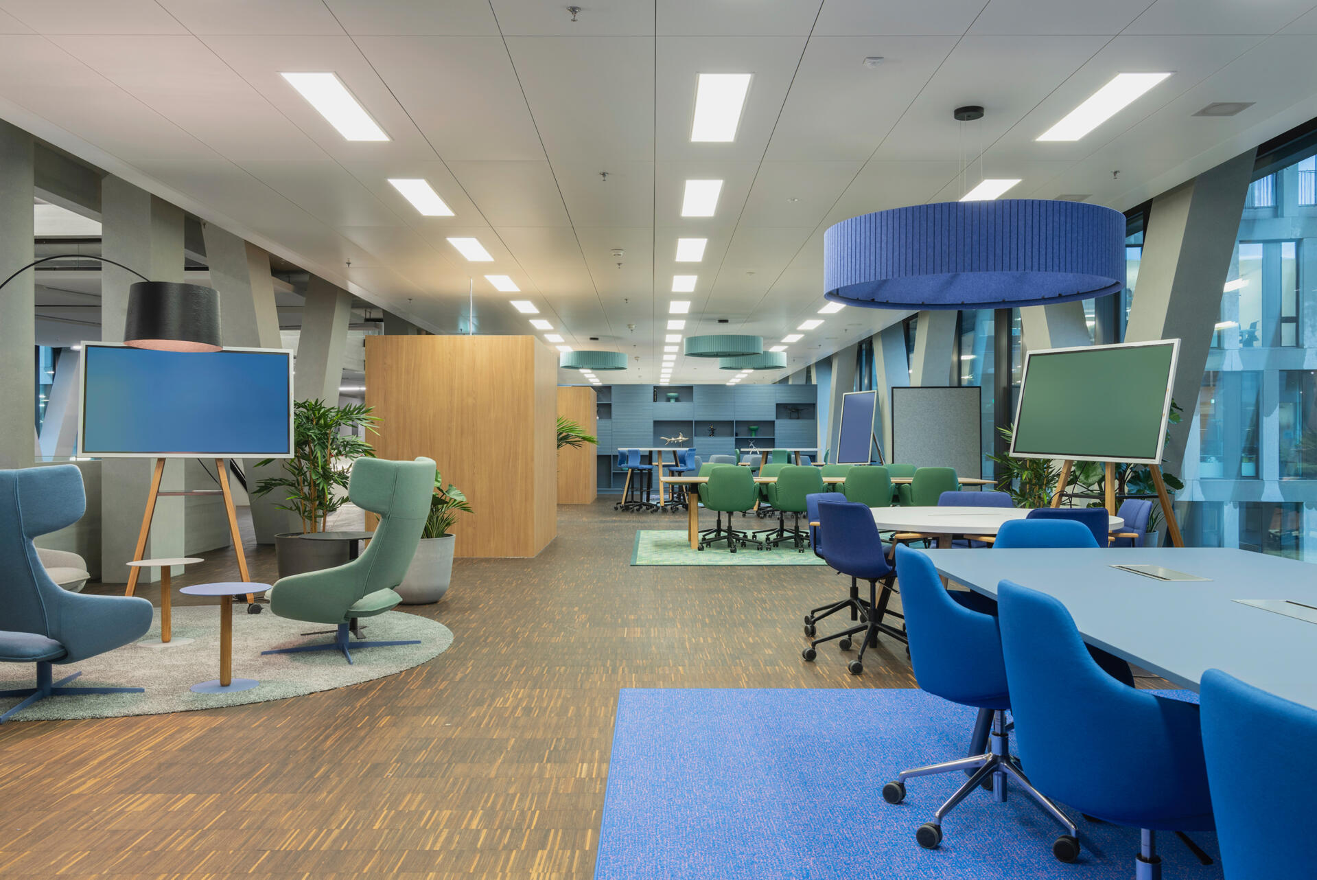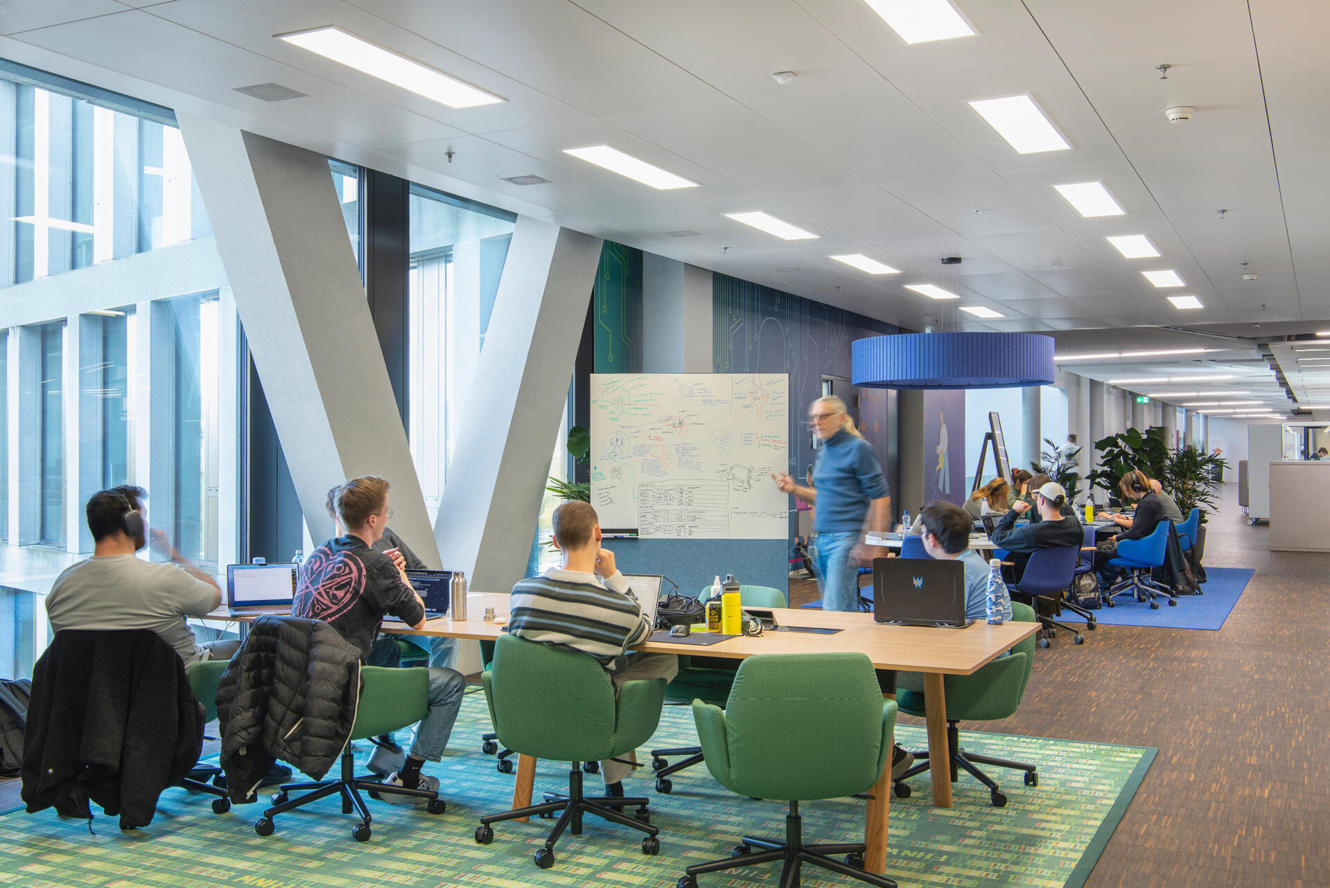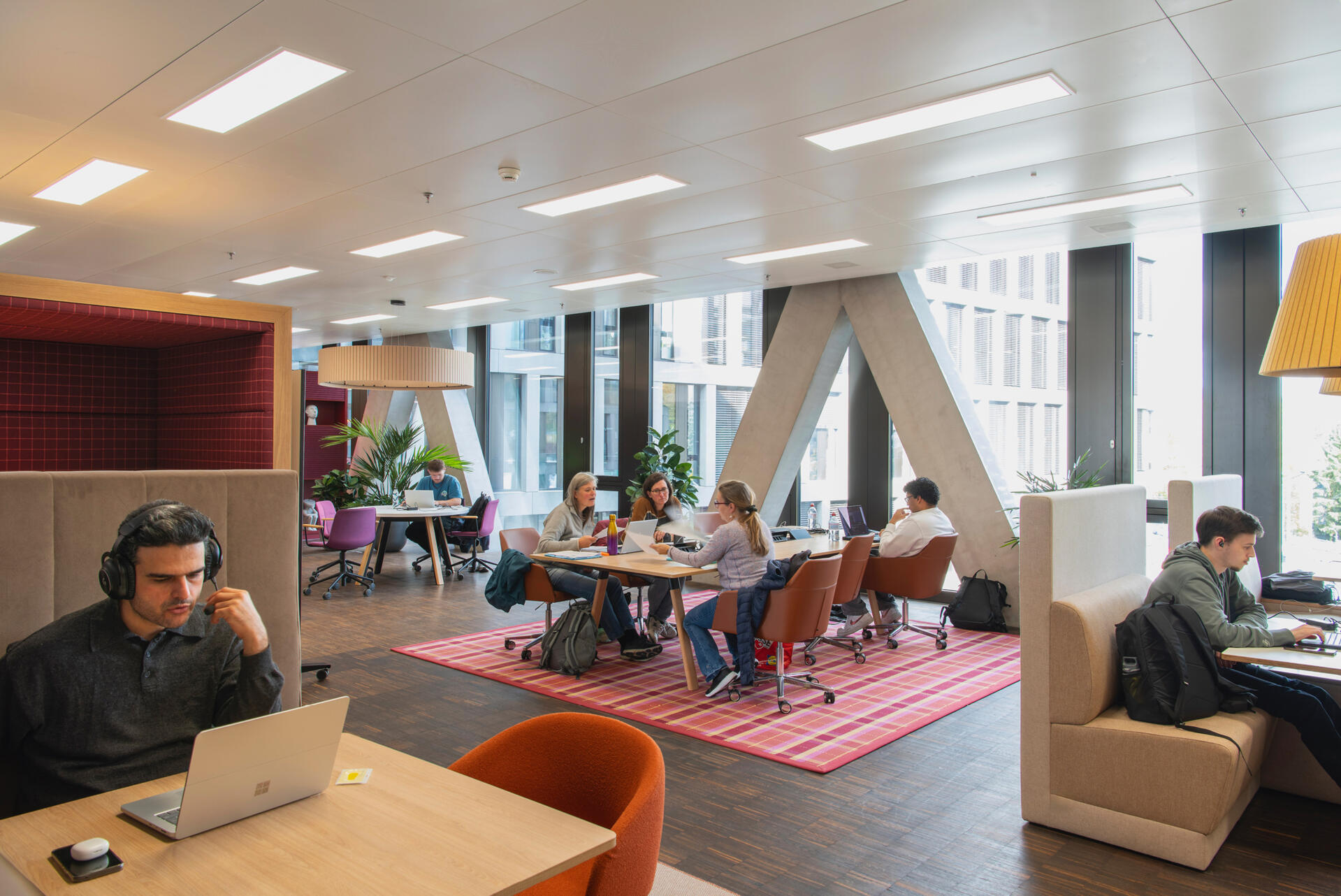 Diese offenen und einladenden Bereiche bieten eine Vielzahl an Möglichkeiten für die Studierenden und Dozierenden, gemeinsam zu lernen, selbstständig und konzentriert zu arbeiten, Unterricht abzuhalten oder sich einfach zu treffen und miteinander ins Gespräch zu kommen – wodurch die Präsenz vor Ort zu einem echten Mehrwert wird.