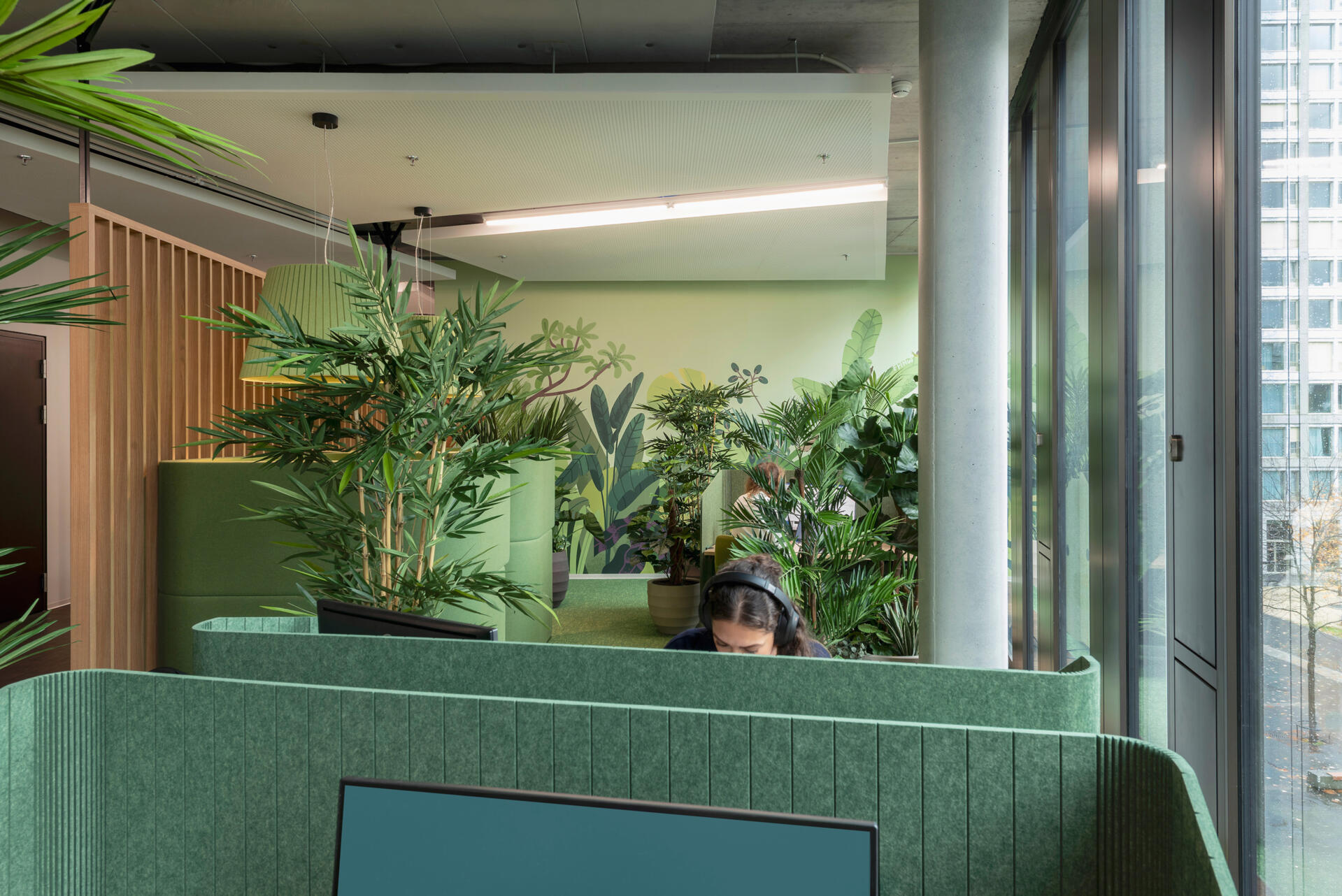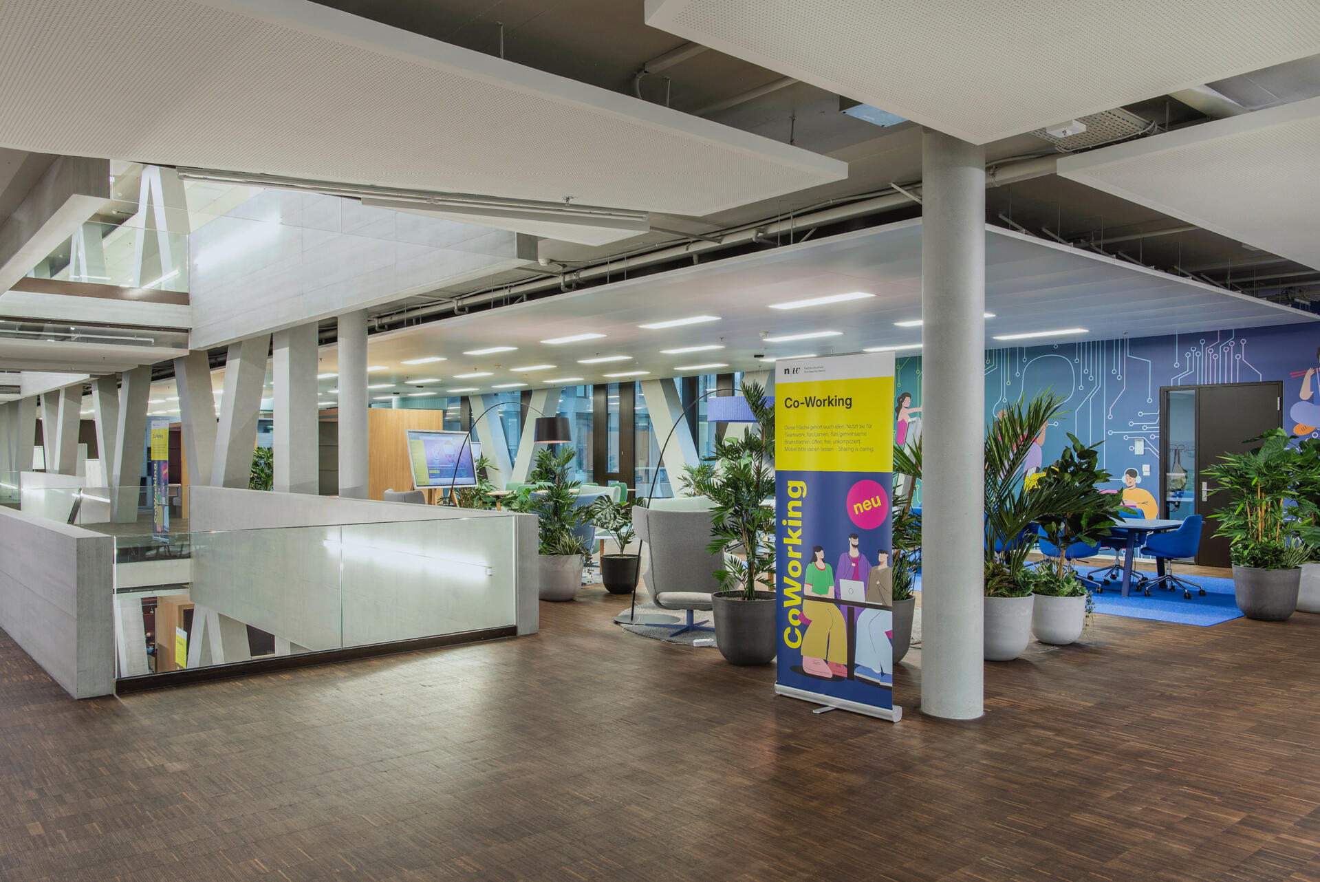 Es war deshalb ein sehr ausdrucksstarker Gestaltungsansatz gefordert, der durch eine gezielte räumliche Zonierung mittels Möbel, kräftigen Farben, vielschichtigen Materialien, grosszügiger Begrünung und charakteristischen Grafiken die offene, kollaborative und zukunftsorientierte Kultur der FHNW im Raum spürbar macht.