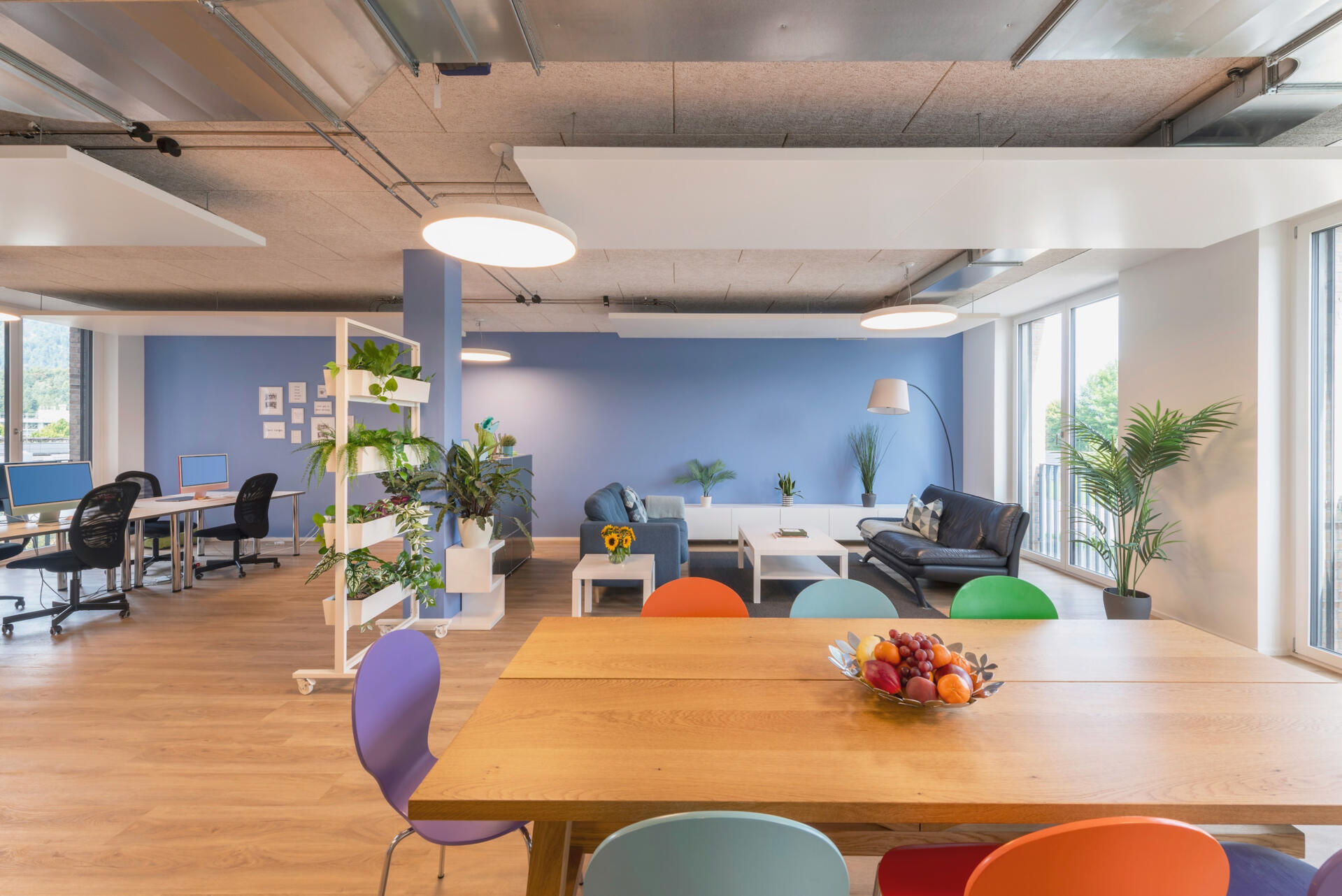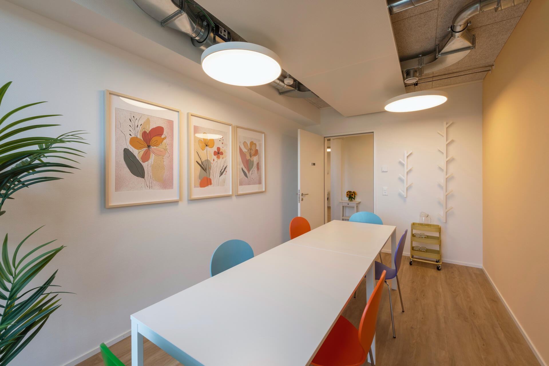 The upper floors house the classrooms, complemented by themed meeting rooms, and a warm, inviting staff room. Divided into three distinct zones – a large communal dining table, a sofa lounge and a focused work area – this space fosters both collaboration and quiet concentration.